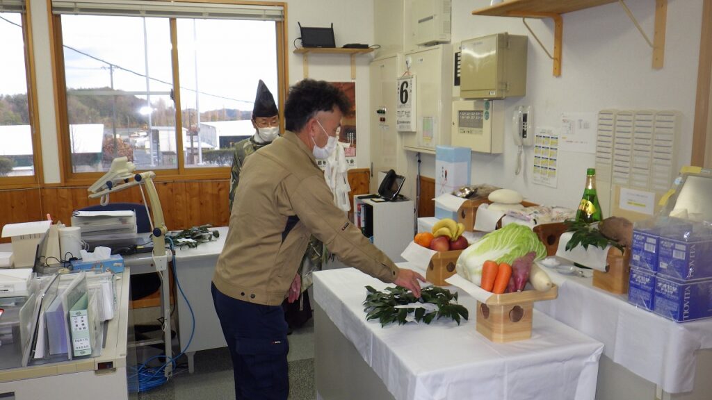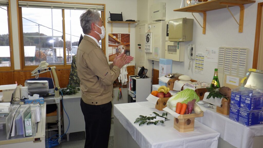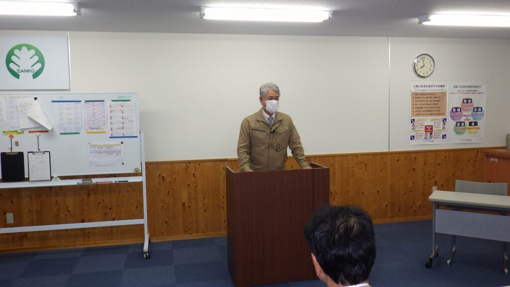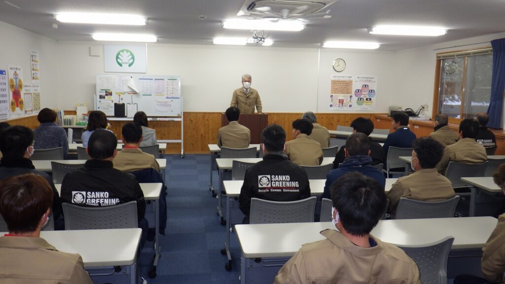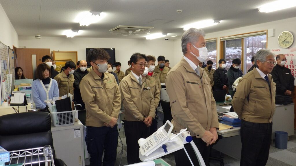 社員全員を前に、河村社長の年頭あいさつからスタートです。